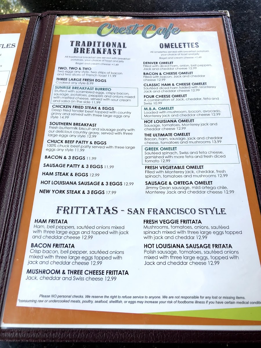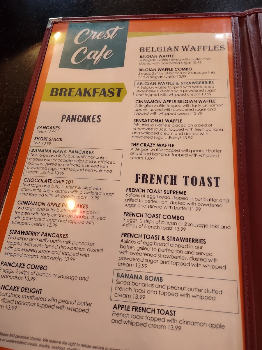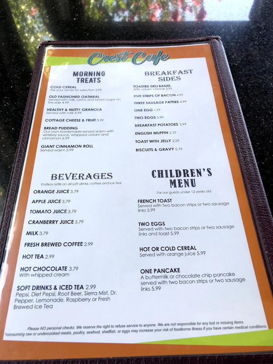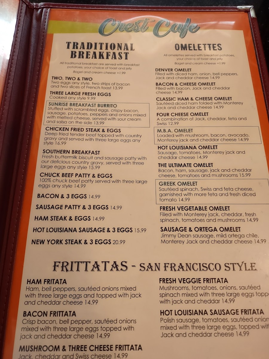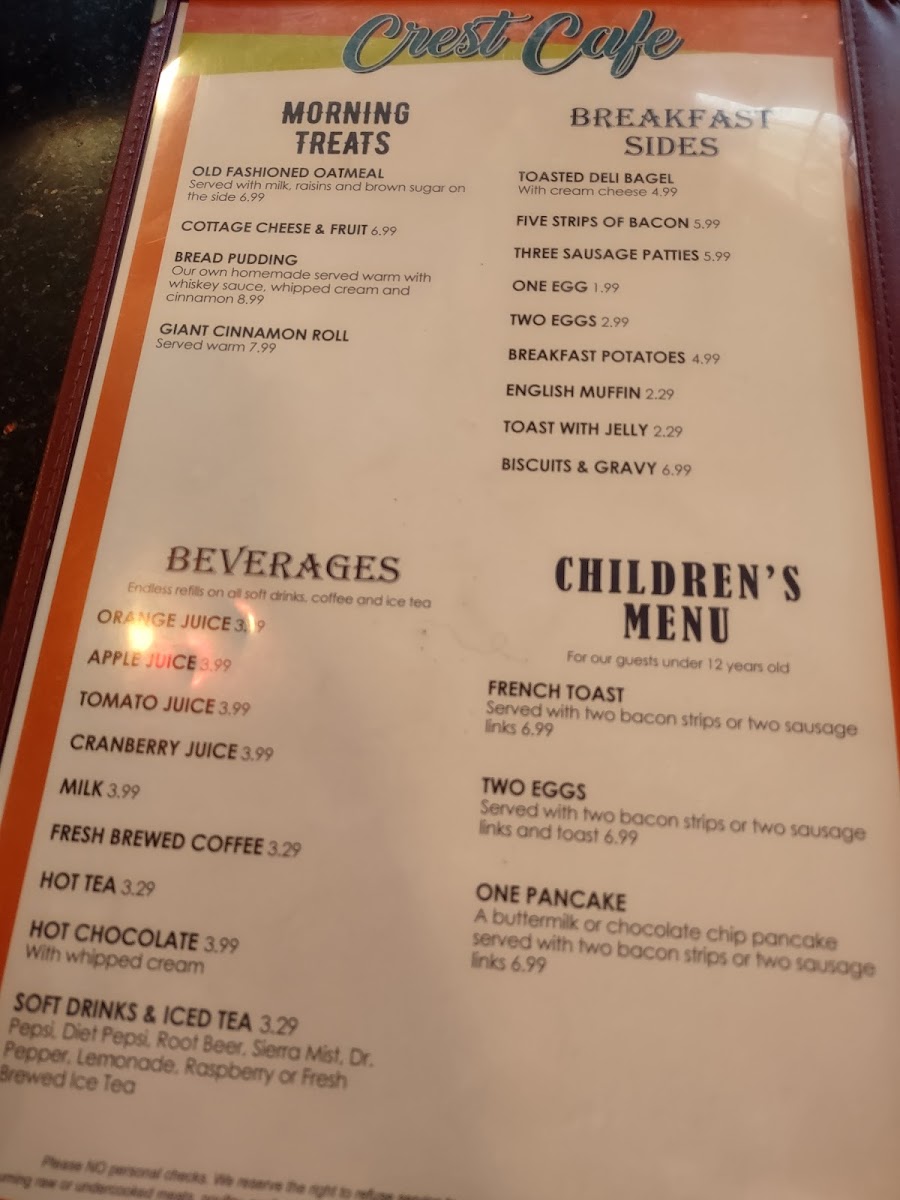 Overall, the Crest Cafe menu encourages relaxed dining where comfort and familiarity take center stage, making it a natural choice for anyone seeking a friendly spot to enjoy a well-rounded, satisfying meal anytime from early breakfast through lunch.